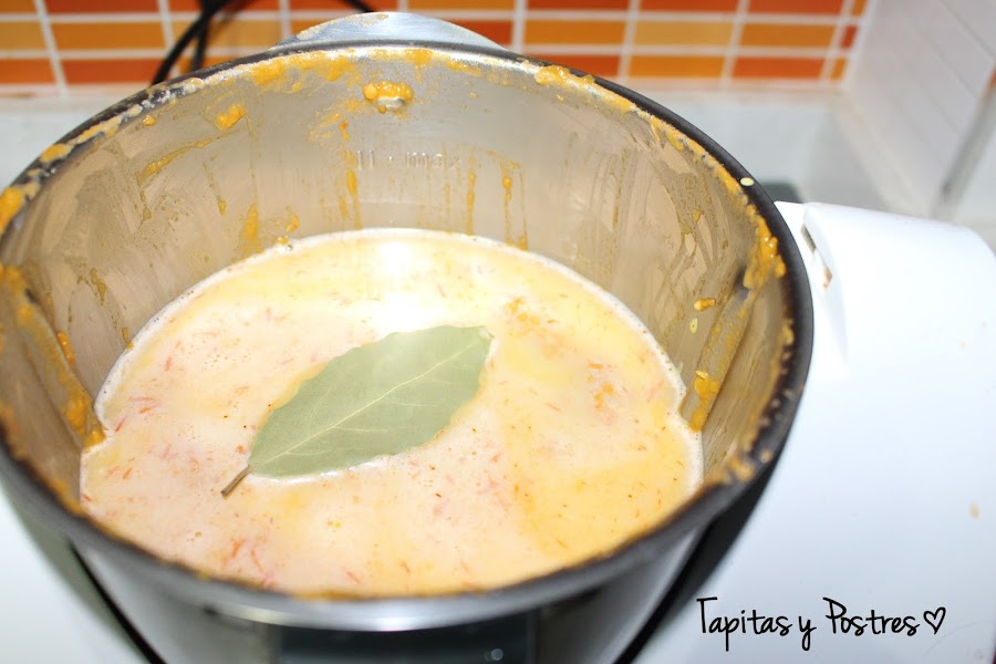 Añadimos al sofrito el majao de almendras, ajo y pan, agregamos un litro de agua y una hoja de laurel y cocinamos 10 minutos, varoma y velocidad 1.