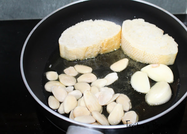 En una sartén con aceite freimos las almendras, los ajos y el pan, hasta que estén dorados, pero que no se nos quemen.