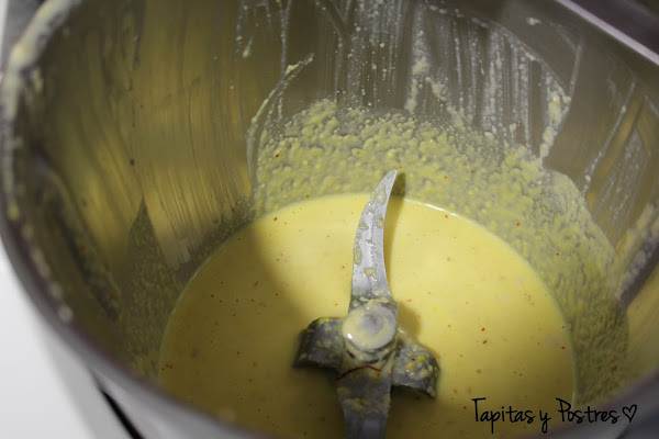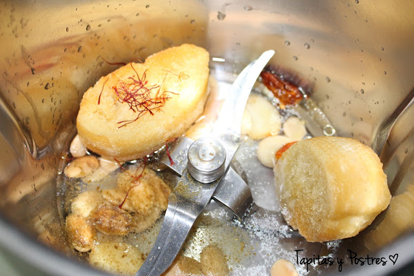 Ponemos las almendras, ajos y pan en el vaso de la batidora junto con las hebras de azafrán, el colorante, el comino, la pimienta, las guindillas (sin pepitas, ojo), la sal y el agua y lo trituramos hasta que nos quede un caldo espeso. Reservamos.