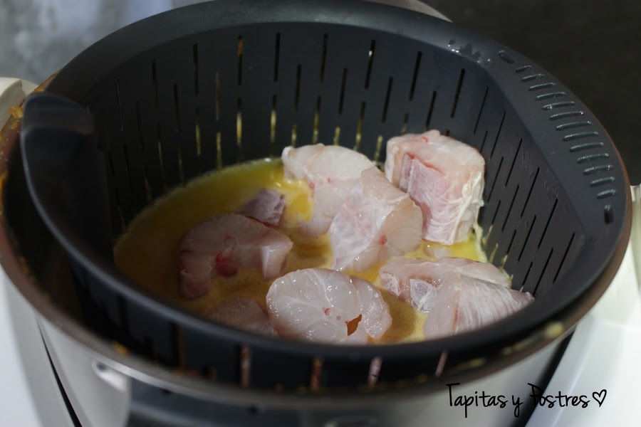 Ponemos en el cestillo la pintarroja troceada y sazonada junto con las almejas y lo introducimos en el vaso con cuidado. Programamos 15 minutos, 100º y velocidad 1.