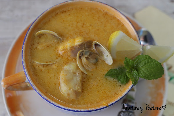 Y ya tenemos nuestro caldillo de pintarroja, muy caliente y picante, acompañado de un buen chorro de limón y unas hojas de hierbabuena.
