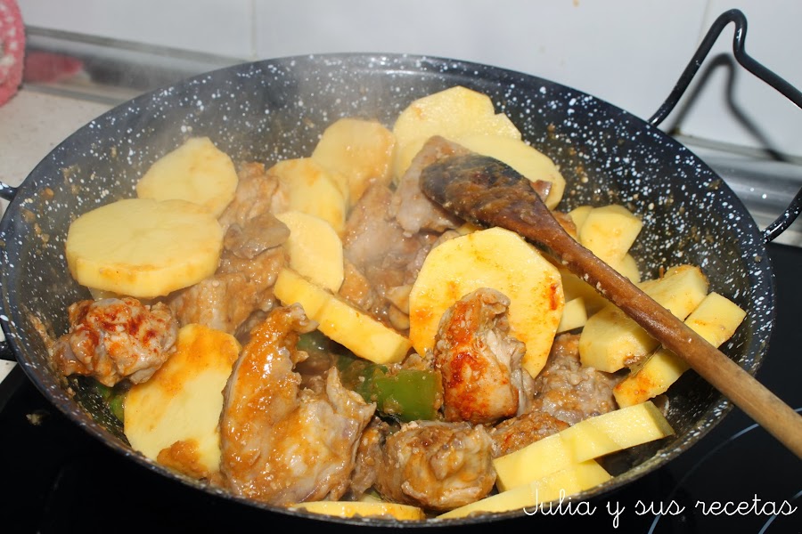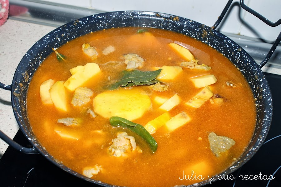 A mi me gusta mucho , en mi casa lo hacía mi padre y le llamaba "ajo de patatas". Es un plato de cuchara que a parte de su rico sabor es reconfortante. Yo lo he hecho con conejo como se hace en mi casa pero se puede hacer también con pollo o sin ponerle nada de carne.