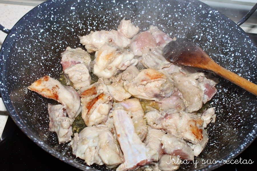 En una cazuela ponemos un chorro de aceite y sofreímos el conejo al que hemos puesto una poquita sal. Añadimos el ajo y la cebolla muy picaditos y sofreímos.