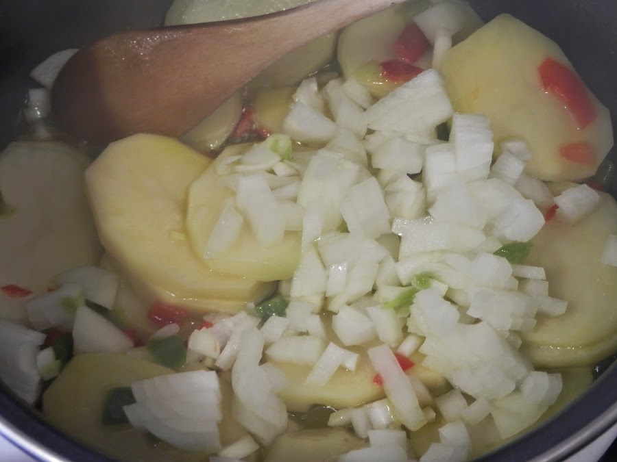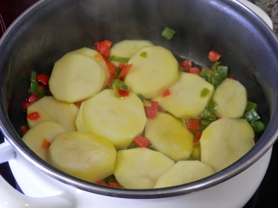 Cortamos las patatas en rodajas de medio dedo de grosor y las sofreímos junto con la cebolla.