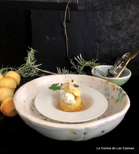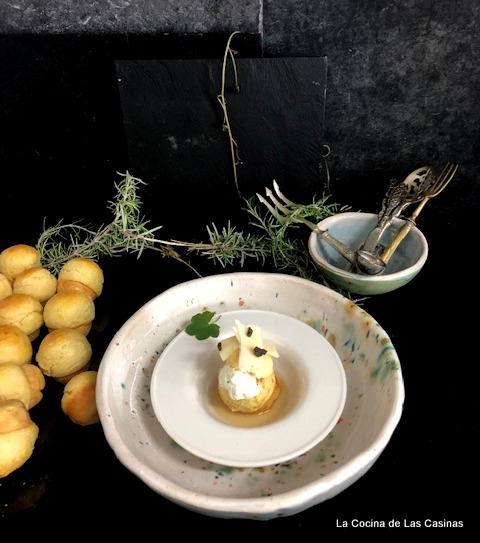 Desgrasa el caldo, cuélale y calienta en la cazuela, rellena con la crema tus brioches y adorna como quieras, yo he puesto unas lascas de queso gruyère y espolvoreé con la trufa rallada.