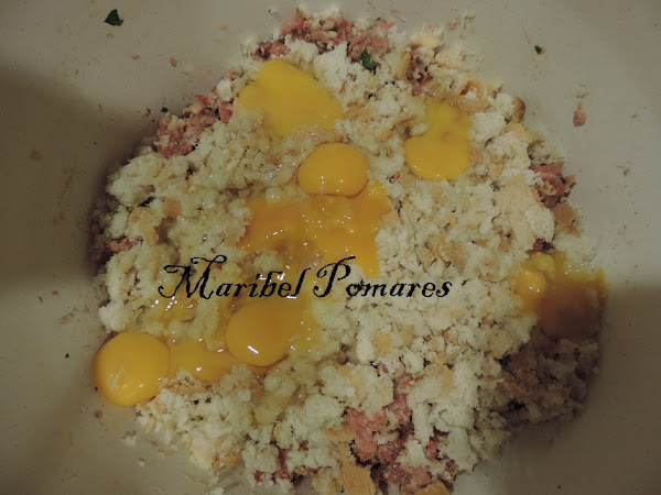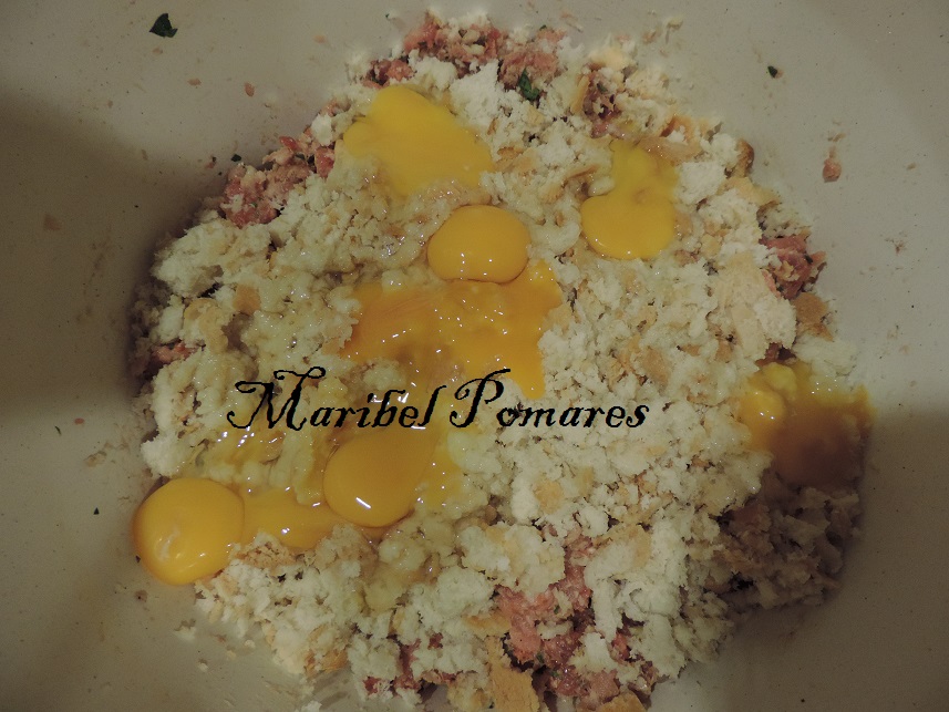 Añadimos el pan remojado y desmigado con los huevos, aquí se ven 8 huevos porque son pequeños y pusimos el doble, ya que solo se necesitan 4.