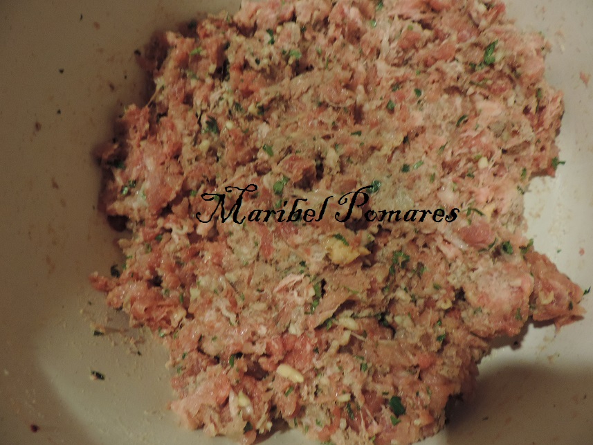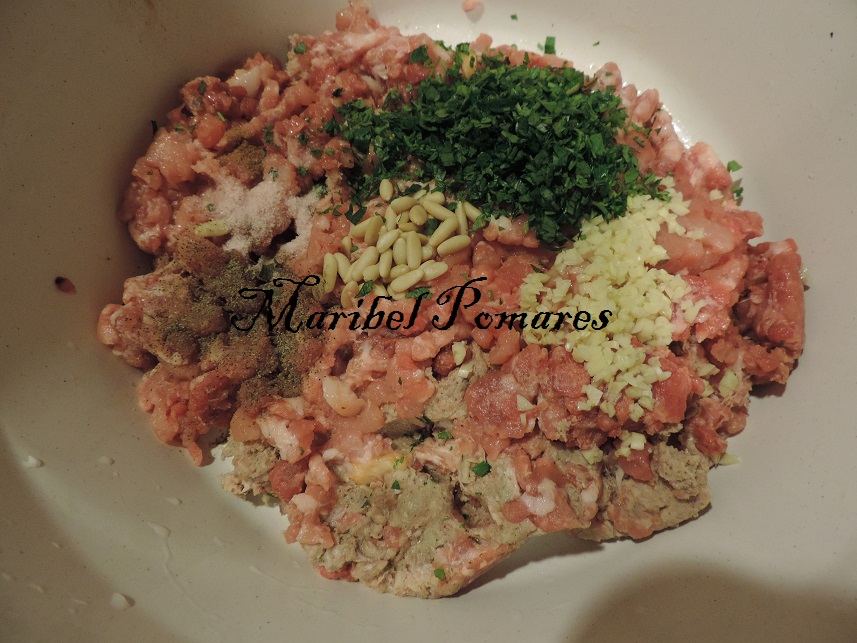 Añadimos el ajo y perejil picado, sal, pimienta, canela y piñones.