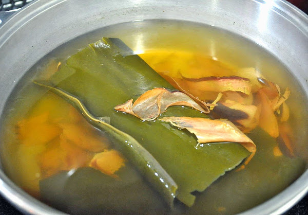 2. Coloca tres litros de agua en una olla profunda, añade la alga kombu y déjala macerar media hora.