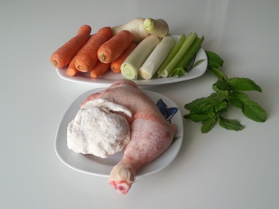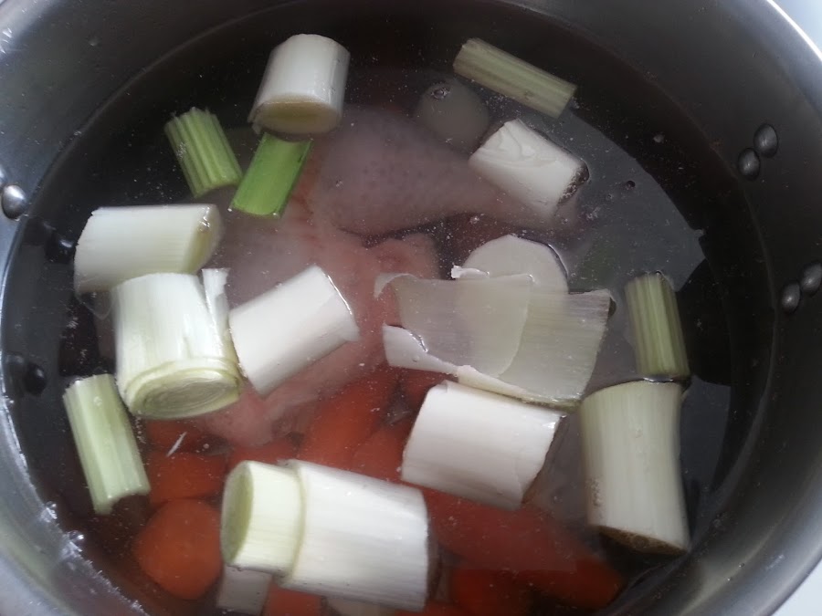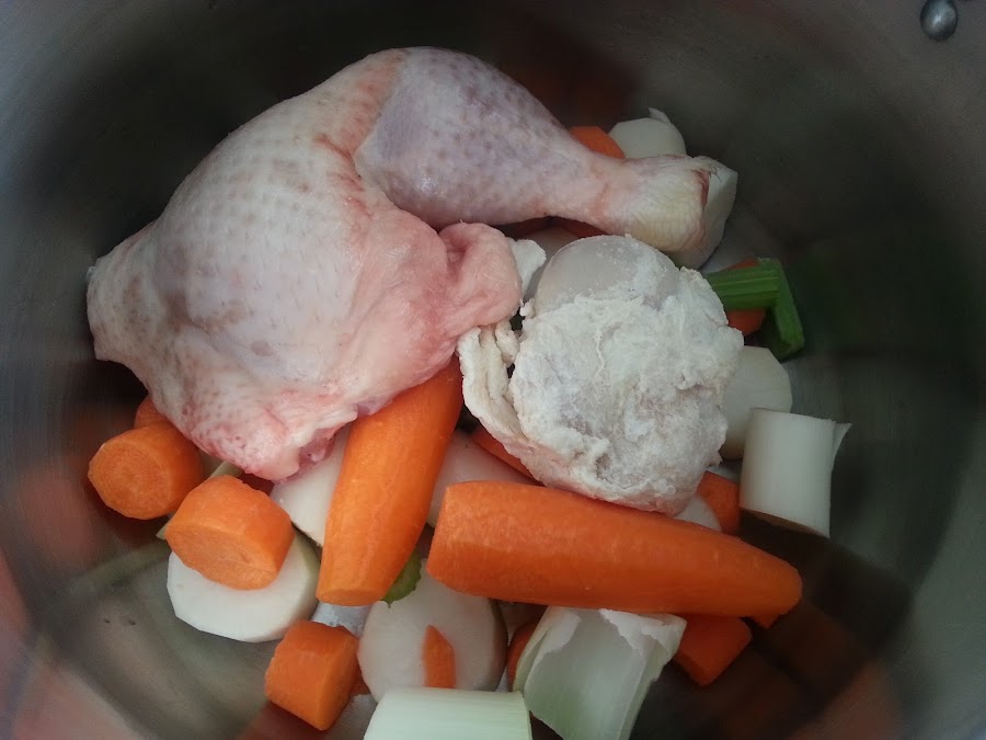 4. - Ponemos todos los ingredientes troceados en una olla y le añadimos el pollo y el hueso enjuagados.