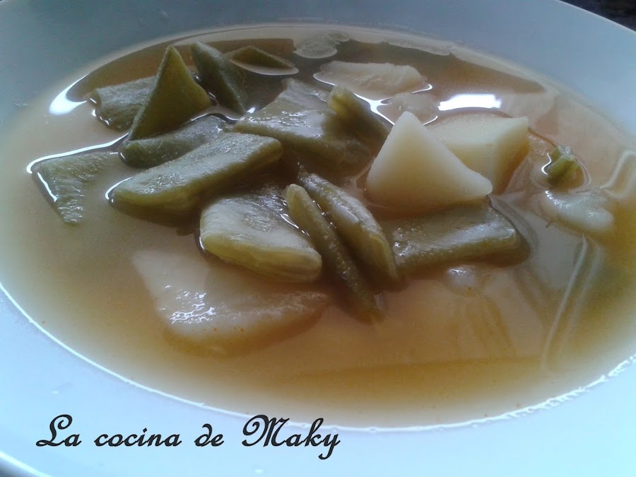 Lavamos las judías verdes , quitamos los hilos (si tienen) las troceamos y reservamos.