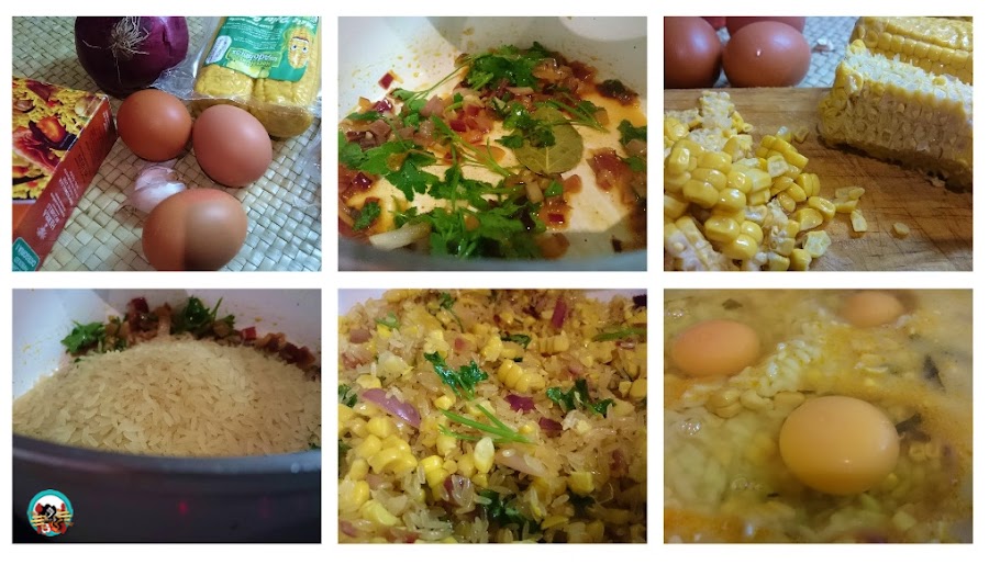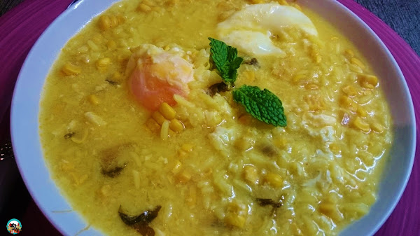 2.- Añadimos el arroz y lo removemos bien. Dejamos que se cocine 3 minutos, después, ponemos los gramos de millo o maíz. Rehogamos todo bien y cubrimos con agua. Rectificamos de sal y dejamos que se cocine 30 minutos a fuego medio. Añadimos los huevos de a uno y dejamos que se cocine unos minutos más dentro del caldo. Apagamos el fuego y dejamos reposar unos minutos. Servimos caliente. (Puedes cambiar el arroz por 4 o 5 papas cortadas en trozos medianos).