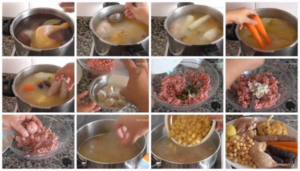 La noche anterior tendremos que poner los garbanzos en remojo.En una olla grande ponemos todas las carnes y huesos a cocer con una hoja de laurel y sal; los pies de cerdos los lavaremos bien y si fuera necesario podéis dejarlas en remojo durante una hora en agua fría con un chorrito de vinagre.