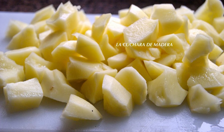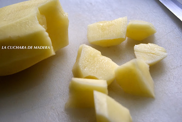 Las papas las pelamos y lavamos, las vamos a cortar con la técnica o tipo de corte llamado cachelos o también llamado quebrado o encontradas, que produce más salida de almidón y el caldo queda más espeso.