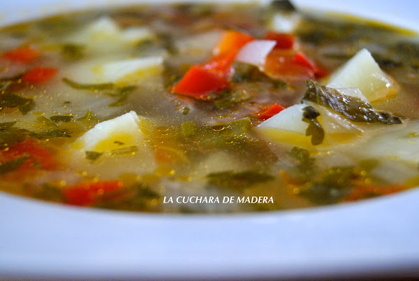 En un plato pondremos unos cucharones del caldo y papas