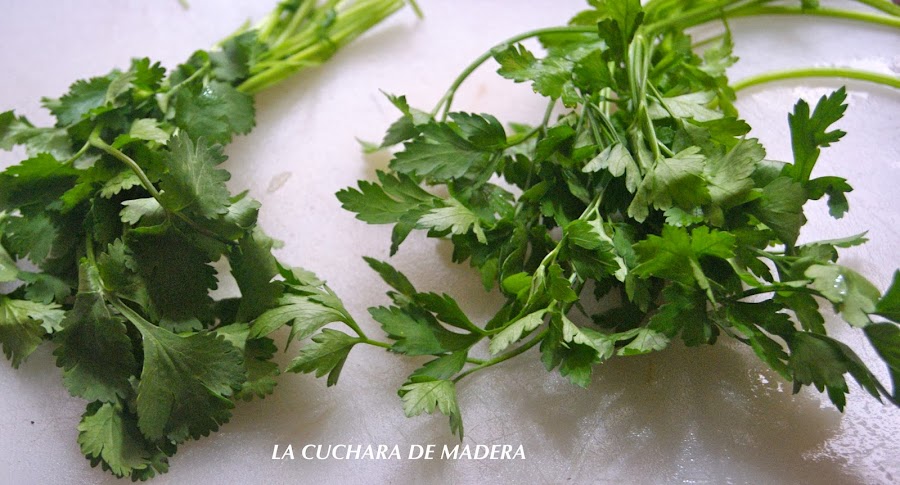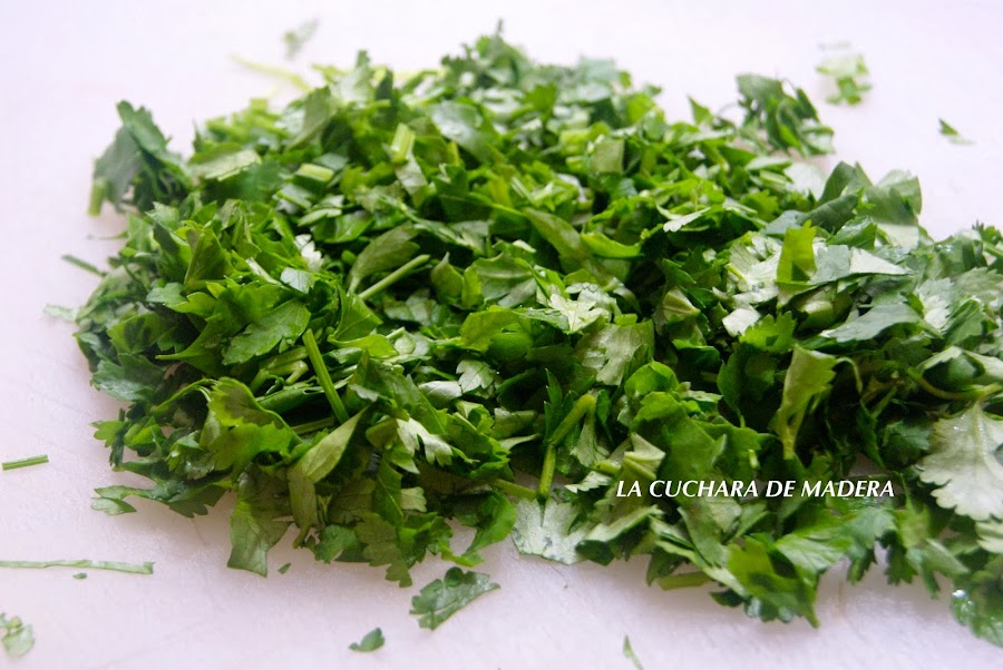 Agregamos al caldero que tiene la fritura agua e introducimos las papas en él dejándolo a fuego medio unos 15 minutos. Mientras lavamos y picamos el perejil y el cilantro