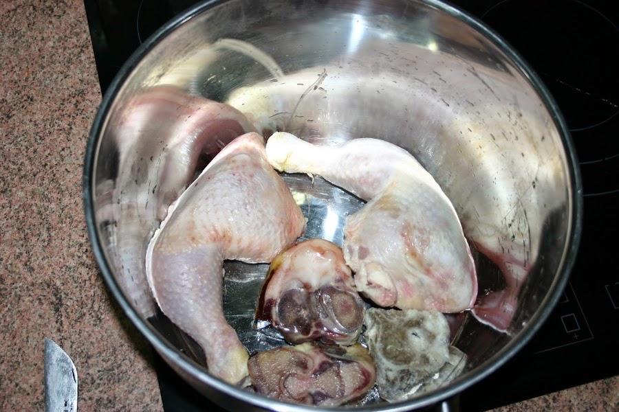INGREDIENTES 1 cuarto trasero de gallina o de pavo (puedes usar pollo pero deja más grasa en el caldo, en todo caso quita siempre la piel) ? 300 gr de jarrete (morcillo) de ternera ? 1 hueso de costilla salada ? 1 hueso de ternera fresco ? 1 hueso blanco salado ? 1 hueso de espinazo salado ? 1 trozo de corteza de cerdo salada ? 1 hueso de jamón -1 trozo de tocino fresco salado (yo nunca lo pongo p ...