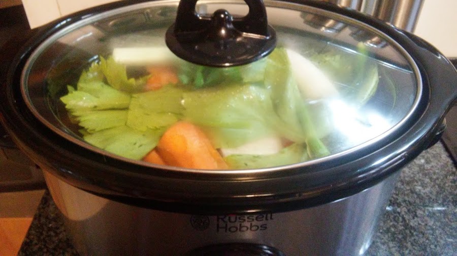 En esta tercera receta que pruebo con mi Russell Hobbs he preparado el caldo tal y como lo haría en una olla convencional. Simplemente tendrás que poner los ingredientes, elegir la temperatura y olvidarte. Cuando regreses tendrás tu caldito hecho.Caldo de pollo en Slow Cooker