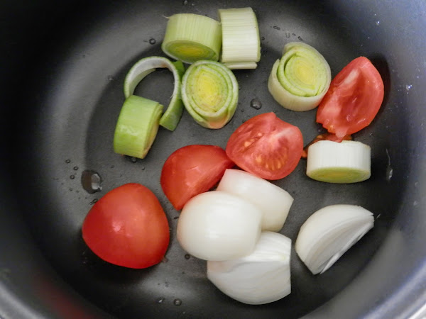 Cortamos la cebolla, el tomate y el puerro en trozos grandes (el tomate y la cebolla en cuatro y el puerro en rodajas de dos dedos de grosor).