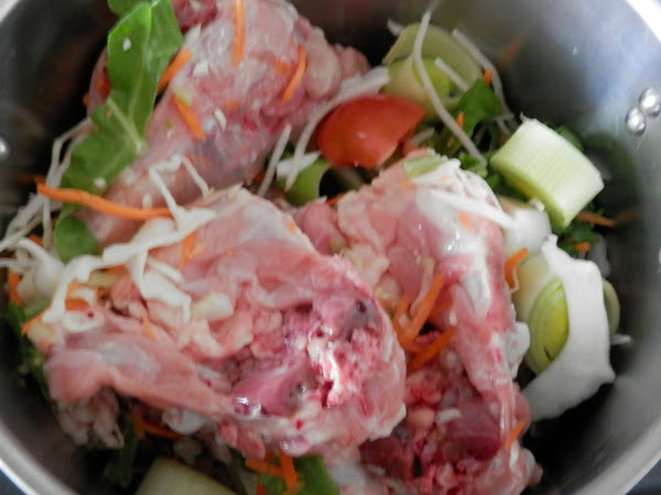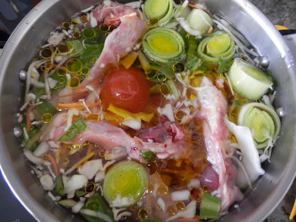 Ponemos una cacerola la verdura y la carcasa, añadimos la bolsa de sopa campesina.