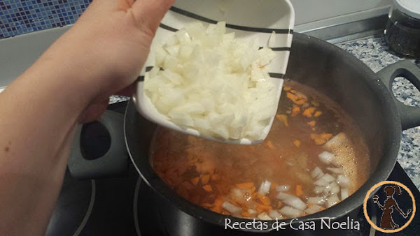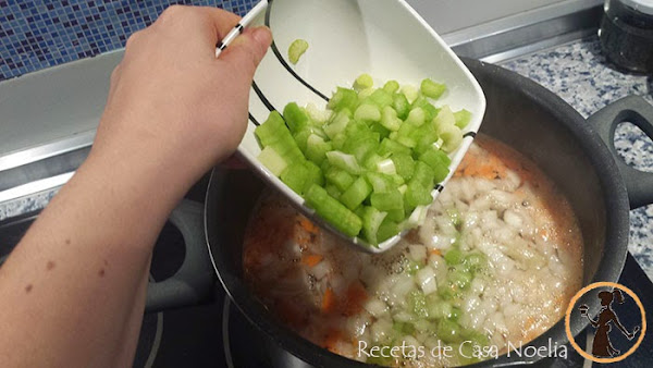 Y ahora poco a poco todo se va incorporando a la olla donde esta cociendo la carne. Y no se os olvide echar un chorrito de aceite de oliva, por aquello del sabor que deja... mmmm...