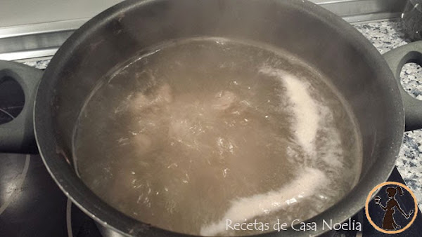 Cuando tengáis cortada la carne, o mientras la cortáis, tenéis que llenar una olla o puchero de agua. Aquí veis que queda un poco para que este" hasta arriba del todo". Luego tendremos que ir echando más, pero esperar a ver lo que sale de aquí...
