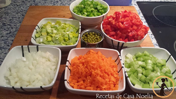 Adivináis que tenéis que hacer con el resto de los ingredientes?? EXACTO, partirlos. Todo a cachitos como si fuera para pisto, no hace falta que sean demasiado pequeños. Yo con lo demás vale, pero con la zanahoria no puedo... me desquicia los nervios. Así que a la picadora y un par de turrums para que no quede muy pequeña y listo! También hay que escurrir la lata de guisantes.