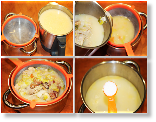 Seguidamente colamos el caldo y rectificamos de sal. El pollo lo corté en trozos pequeños para acompañar con la sopa.