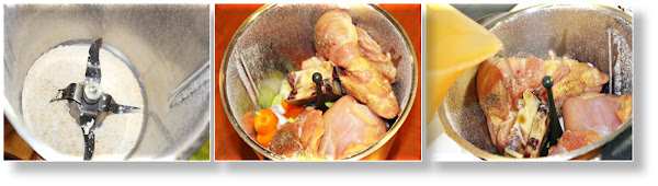 COLOCA LA MARIPOSA y añade al vaso el hueso, la zanahoria laminada y pelada, el puerro limpio y laminado, los dientes de ajo, los 2 muslos con contramuslo de pollo (los puse enteros), y el agua. PROGRAMA 35 MINUTOS / 100ºC / VEL. 1.