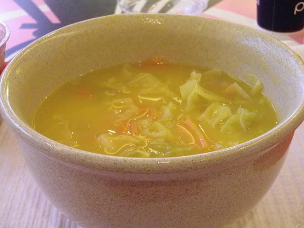 Mientras cuecen las patatas, se fríe aparte el chorizo en rodajas en una sartén sin grasa, durante 5 minutos. Escurre el exceso de grasa y vierte el chorizo en la sopa, una vez cumpla el tiempo del paso anterior.Ponemos a punto de sal y pimienta. Añadimos la col en tiras finas y deja cocer 10 minutos.