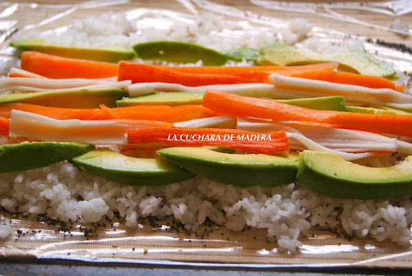 Lavamos y cortamos la zanahoria, pelamos y cortamos también el aguacate y por último los palitos de cangrejo.Lo ponemos encima del arroz, dejando un pequeño espacio al principio y final de la base de arroz.