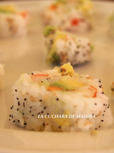 Este plato japonés es muy suave, hay varias versiones dependiendo del restaurante, nosotros siempre los pedimos sin mahonesa, pero esto es al gusto...al igual que en casa los preparé sin alga nori ya que a mi tiburona no le agrada su sabor. Unos restaurantes japoneses lo preparan con langostinos y otros con palitos de cangrejo.....como siempre digo, se pueden adaptar al gusto.