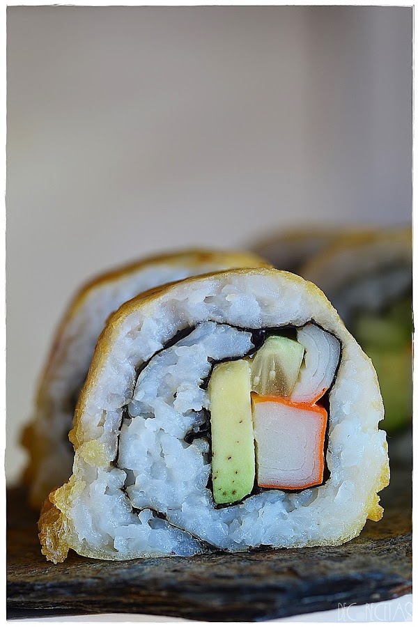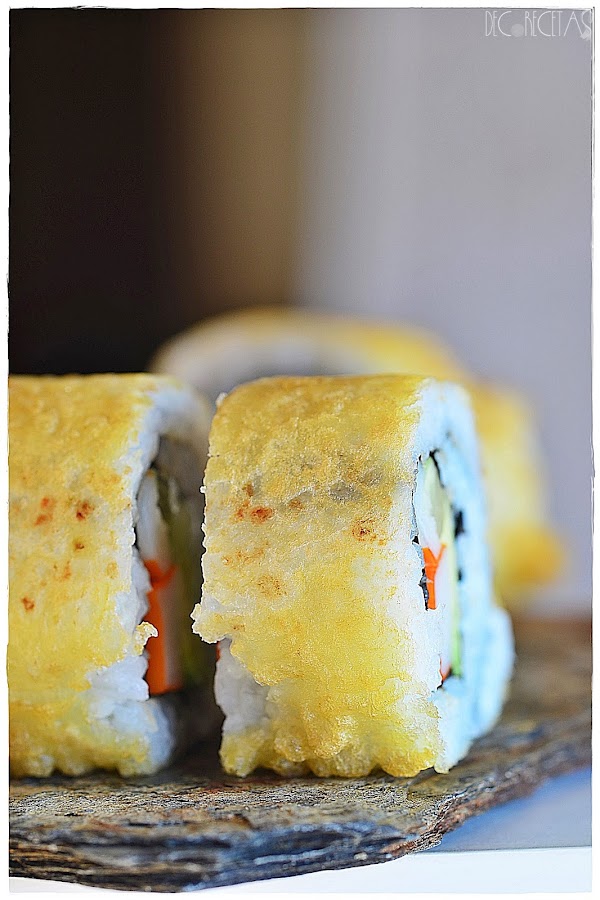 Realizamos el sushi como normalmente, la receta la tenéis aquí, y en este caso rellené con pepino, aguacate, y palitos de cangrejo. Una vez listo el rollo, rebozaremos en una mezcla de una yema de huevo y media cucharadita de levadura química, con media taza de maicena o harina de maíz, y aproximadamente otra media taza de agua muy fría. Batimos todo muy bien conjuntamente para que no haya grumos, y es en esa mezcla en la que rebozamos bien nuestro rollo de Sushi que llevaremos a la sartén bien caliente con apenas aceite dándole vueltas continuamente para evitar que se queme