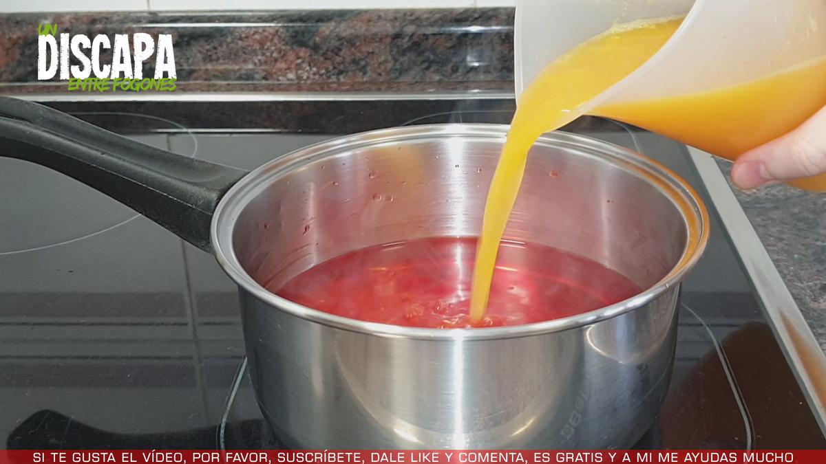 Mezclamos y añadimos el zumo de naranja y a fuego medio dejamos que se vaya calentando para que el azúcar se vaya disolviendo.