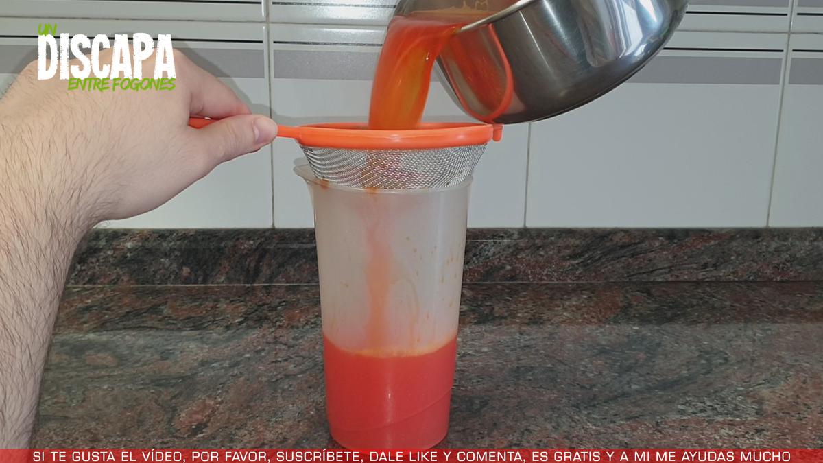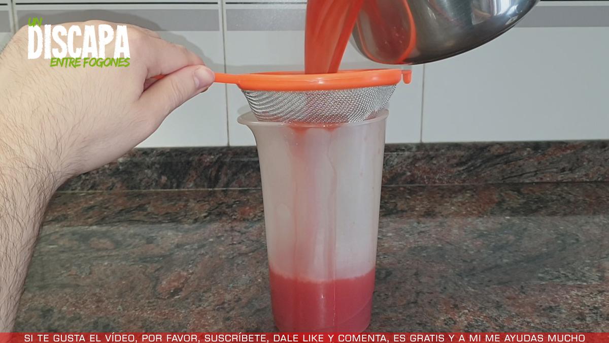 3Después lo pasamos a un recipiente colandolo para que no nos caiga la pulpa de la naranja y dejamos que se atempere.