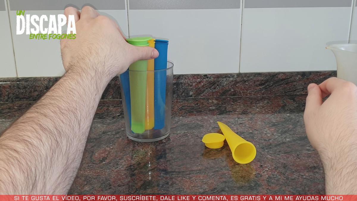 Colocamos los calippo en un vaso alto para que queden lo más rectos posible y los llevamos al congelador hasta que estén bien congelados.