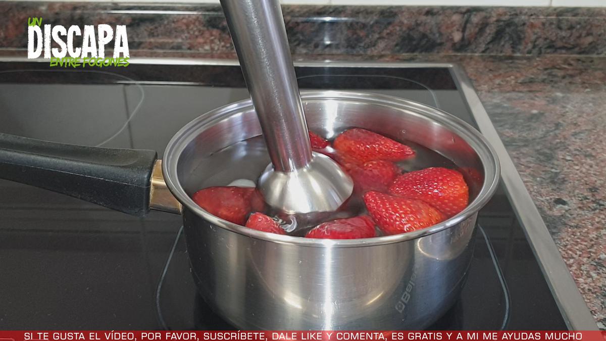 Añadimos el azúcar y el agua en un cazo, añadimos también las fresas y procedemos a triturarlas.