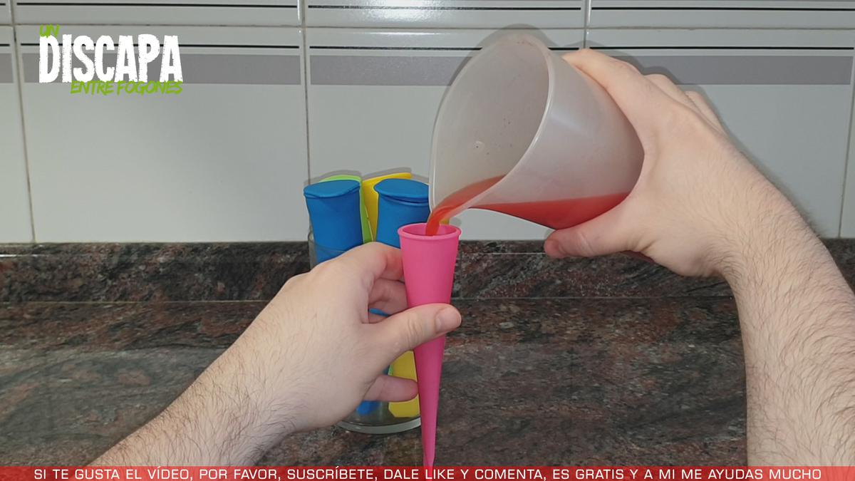 4Y ahora solo falta rellenar los calippos en estos moldes de silicona. No los llenéis hasta arriba del todo porque al congelarse el calippo crece de tamaño.