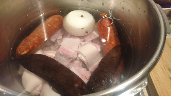 Troceamos la carne de la pata, el chorizo y la morcilla. Reincorporamos todo a la olla.