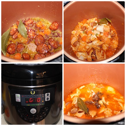 Ponemos los callos en la cubeta de la olla GM F junto con 1 cebolla entera, 3 dientes de ajo enteros, 2 hojas de laurel, pimienta en grano, agua hasta cubrirlos y sal. Programamos el menú guiso, a 110º de temperatura, válvula cerrada, media presión durante 8 minutos.