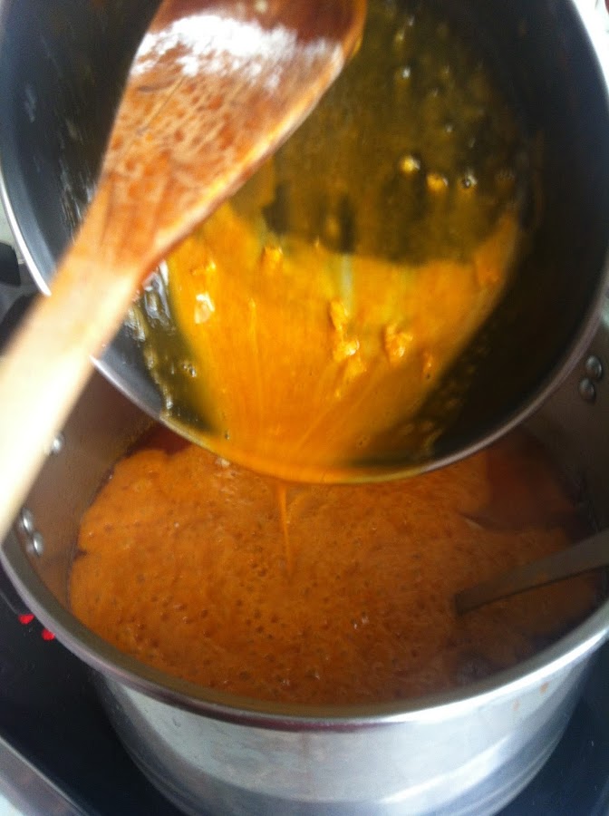 Se añade la cucharada de harina y se tuesta un poco. Se retira del fuego y se añade el pimentón, removiendo el conjunto. Se vierte sobre el guiso (yo retiré un poco del caldo de la salsa para que no quedaran muy claras, si es necesario se agrega después).