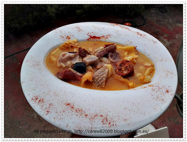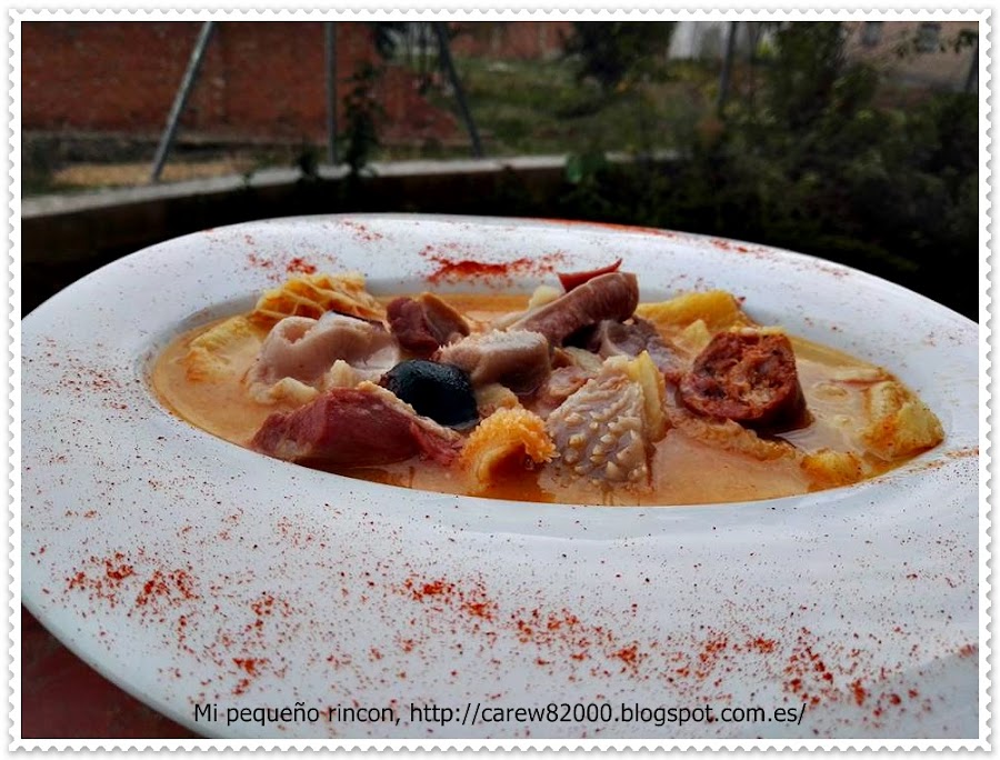 Una vez ha hervido durante media hora a fuego máximo, se añaden los callos, el morro, los huesos de jamón, el tocino y que hiervan durante unas 2 horas aproximadamente, (1 hora en olla exprés).