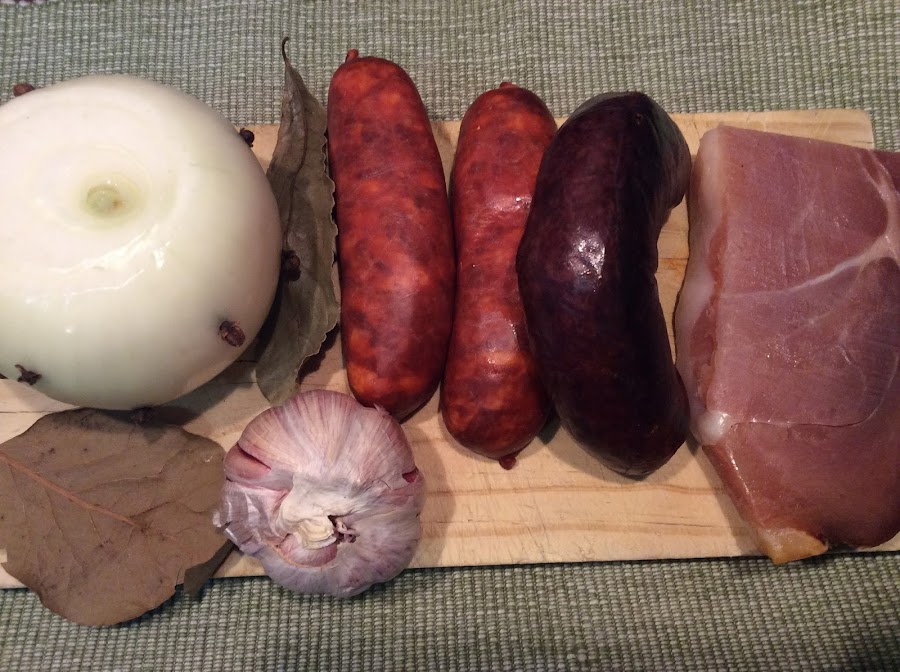 Cuanto termine el tiempo sacamos la cubeta de la olla y rescatamos la cebolla y la cabeza de ajos. Cortamos en rodajas los chorizos y la morcilla y desechamos el jamón, porque habrá quedado seco y fibroso. Pelamos los ajos y los colocamos junto con la cebolla en un recipiente junto con un cazo de caldo. lo trituramos con una batidora y reservamos.