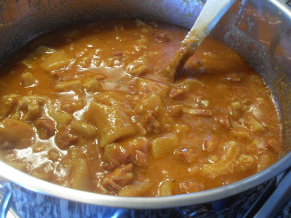 Poner en la cazuela el jamón, la guindilla cortada en varios trozos, el pimentón, la carne de los pimientos choriceros, remover para que no se queme el pimentón. Añadir el tomate rayado, cocinar 20 minutos. A media cocción, agregar el vino blanco, se deja unos minutos evaporar y se añade el sofrito triturado de cebolla y pimiento.