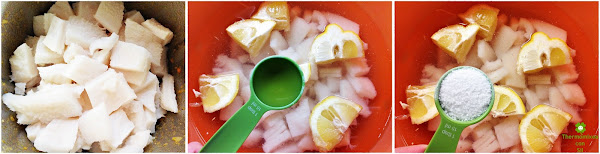 Para limpiar bien los callos, tienes que pasarlos varias veces por agua y finalmente, en un bol grande, añade los callos limpios y cortados en trozos de 3x3 aproximadamente.