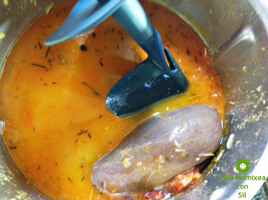 Agrega la morcilla y el jamón y PROGRAMA 30 MINUTOS / 100º / GIRO DERECHA-IZQUIERDA / VELOCIDAD CUCHARA