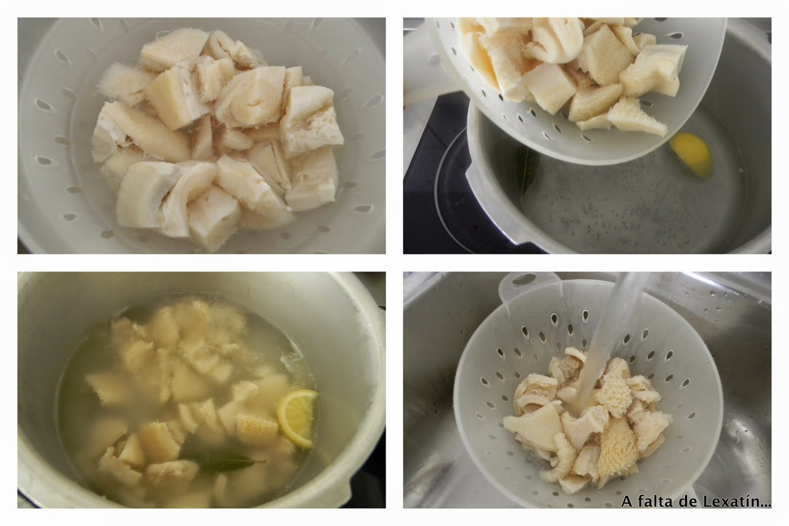 Lavar bien , cortar en trozos y escaldar los callos durante 5 minutos en agua hirviendo con una hoja de laurel y un trozo de limón