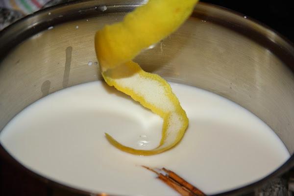 Ponemos a hervir en una olla la leche junto a la corteza de limón y la canela. Mantenemos al fuego sin dejar de remover hasta que la leche cuaje y se formen los grumos.