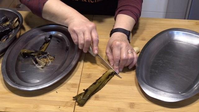 Hemos asado los calçots. Una vez bien fríos los pelaremos y cortaremos. Sólo hay que guardar la parte blanca.