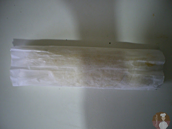 Enrollar la masa de pizza sobre si misma, sellando el borde de cierre con un poco de clara de huevo. Enrollar el calzone sobre el mismo papel de hornear en el que está asentado para que coja bien la forma y el sellado.