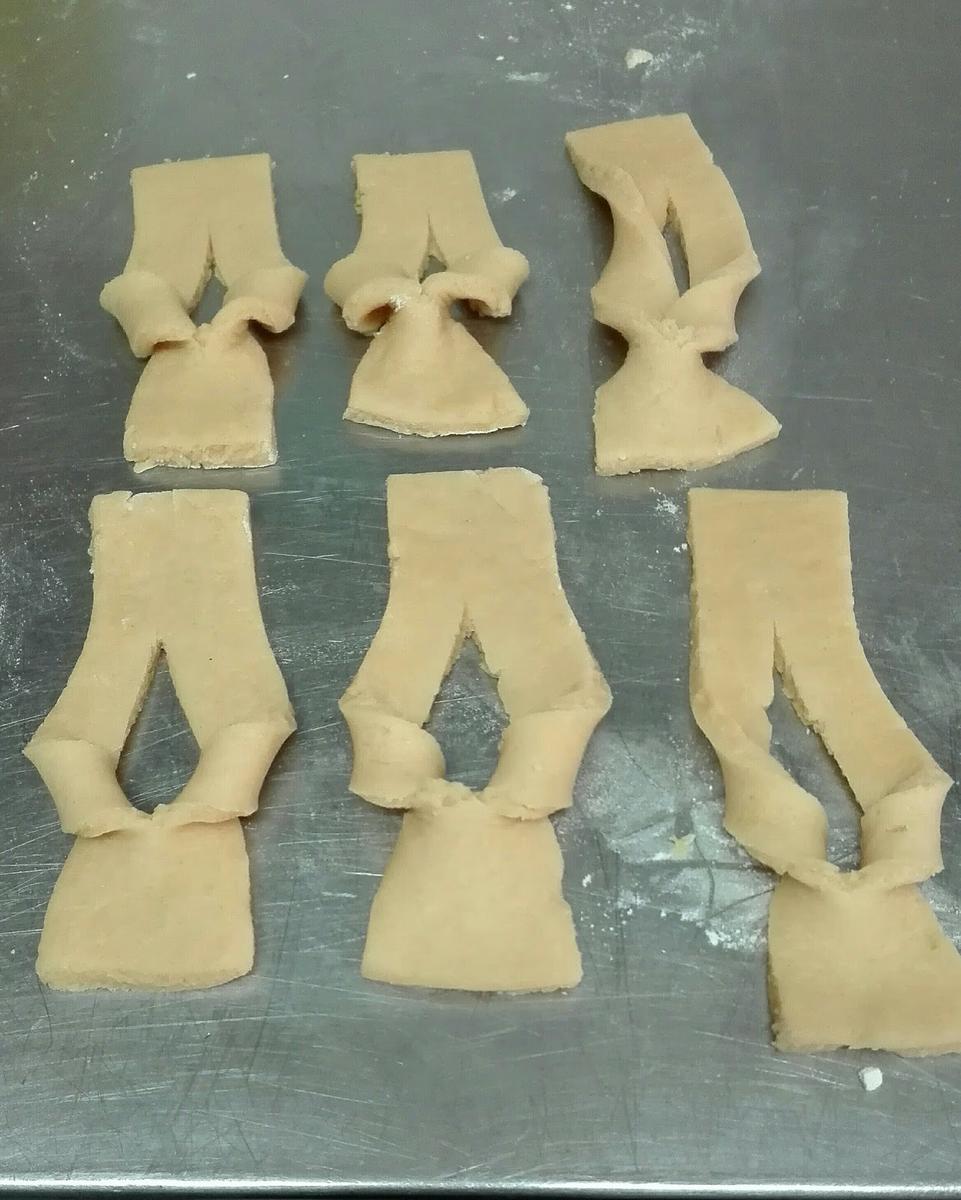 Con un cuchillo afilado ó un cortapizzas cortamos tiras de masa (aprox. 10 x 4 cm) y hacemos en cada pieza un corte interior que abriremos con cuidado introduciendo uno de los extremos y estirando dando la vuelta sobre si mismo.